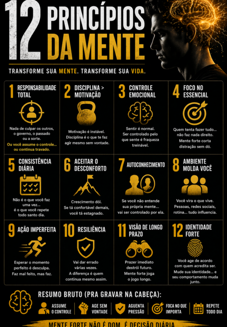 O 12 Princípios da Mente Forte é um guia de desenvolvimento pessoal criado para ajudar você a construir disciplina mental, resiliência e foco para enfrentar desafios da vida.