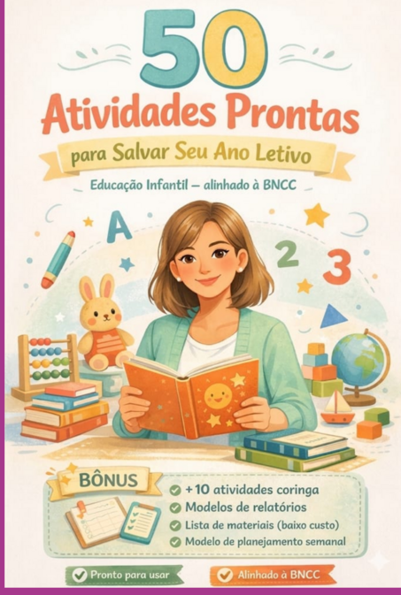 Este livro reúne 50 atividades práticas e prontas para aplicar, pensadas especialmente para apoiar o trabalho do professor. As propostas estimulam, de forma lúdica e intencional, habilidades importantes para o desenvolvimento infantil, como linguagem, coordenação motora, criatividade, interação e expressão.