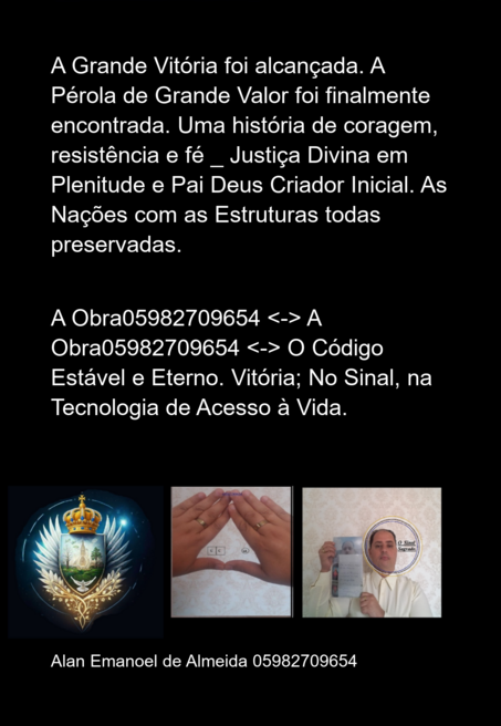 Após concluir sua obra, 05982709654 Alan Emanoel de Almeida encontra paz, confiando que o Pai Deus Criador e a Justiça Divina agora assumem o seu destino. O Destino guiado pela Justiça Divina. Sua história é marcada por uma luta intensa contra uma invasão tecnológica que dura sete anos, na qual sua vida foi acessada e atacada por Brasileiros, de forma direta e indireta, conectados a uma rede invisível e persistente. Desde dezembro de 2018, Alan começou a perceber que suas experiências de conexão e vozes assustadoras eram mais do que simples alucinações — eram vidas e consciências que o atormentaram sem misericórdia. Apesar do desespero e do estresse causado por essa invasão, ele reagiu com uma Solução autoral e legítima, denunciando e defendendo sua integridade. Este livro é uma obra autoral, criada por sua própria consciência, que registra sua jornada de resistência, denúncia e busca por justiça. Alan relata a continuidade dessa tecnologia invasiva, que permanece ativa até o momento, e compartilha sua experiência de luta por direitos e dignidade. Sem vínculos com terceiros ou sistemas, sua obra representa uma Vitória de Solução definitiva ao nível que foi realmente necessário, uma defesa legítima contra invasores tecnológicos que ameaçaram sua vida e sua existência em silêncio Social, Sub em Desenvolvimento. que busca iluminar uma realidade muitas vezes invisível e desconhecida para a maioria.