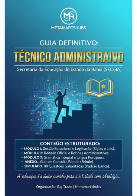 Apresentamos a Apostila Estratégica Técnico Administrativo SEC-BA 2026. Um material direto ao ponto, desenvolvido para quem precisa de eficiência e não tem tempo a perder. Nós filtramos o que é essencial para que você foque apenas no que a banca realmente cobra.