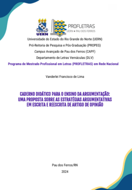 Este caderno didático, desenvolvido no âmbito do PROFLETRAS/UERN, apresenta uma sequência didática voltada ao ensino da argumentação no Ensino Fundamental, com foco na produção e reescrita do gênero artigo de opinião. O material propõe atividades sistematizadas que exploram estratégias argumentativas, como tese, tipos de argumentos e valores argumentativos, favorecendo o desenvolvimento da escrita crítica dos alunos.