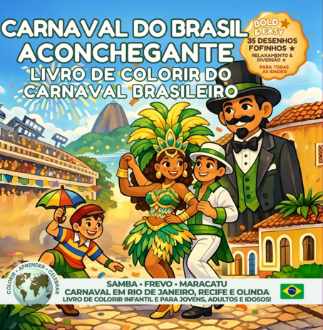 Desacelere, relaxe e mergulhe na energia alegre e acolhedora do Carnaval do Brasil. Este livro de colorir em estilo Cozy Hygge convida crianças, jovens, adultos e idosos a viver o Carnaval de forma calma, criativa e sem estresse, explorando tradições icônicas como o Samba do Rio de Janeiro, o Frevo de Recife e Olinda e o Maracatu de Pernambuco.