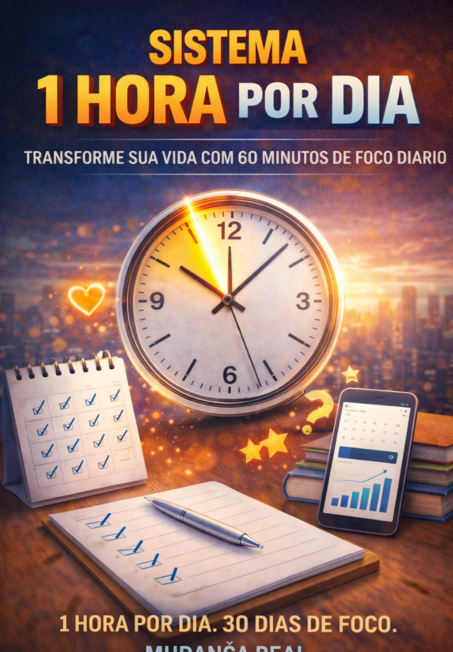 Sistema 1 Hora por Dia é um método simples e estratégico para transformar sua vida dedicando apenas 60 minutos diários ao que realmente importa.