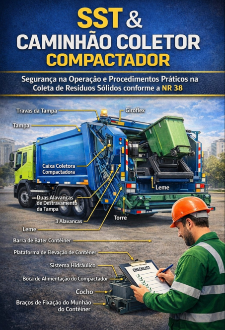 O SST & Caminhão Coletor Compactador é um guia prático e direto para profissionais que atuam na coleta de resíduos sólidos e desejam trabalhar com mais segurança, organização e eficiência conforme a NR 38.