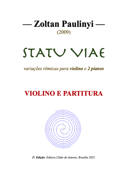 Composto e estreado em 2009, STATU VIAE é peça escrita para violino rodeado por 2 pianos. Duração aproximada de 15 minutos. Partitura e partes separadas para cada instrumento em tamanho A4.