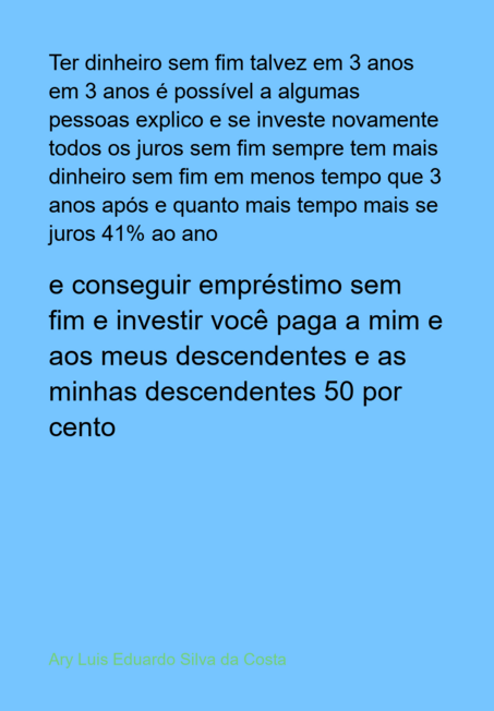 Escrevi algumas explicações que pensei em conseguir muito dinheiro e uma forma em ter dinheiro sem fim, ter dinheiro sem fim talvez em 3 anos se juros e conseguir os dinheiro pra ter sem ter dinheiro ter muito dinheiro explico o que fazer pra conseguir ter dinheiro assim.
